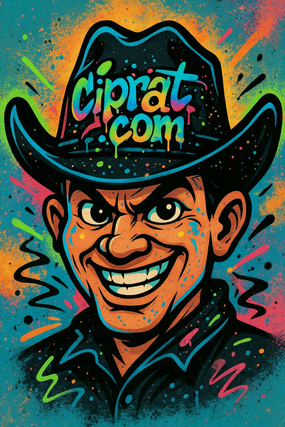 Topi keren warna hitam, aksen neon, tulisan graffiti “ciprat.com”. Dipakai, langsung berasa koboi yang nyari sensasi, bukan nyari sapi.